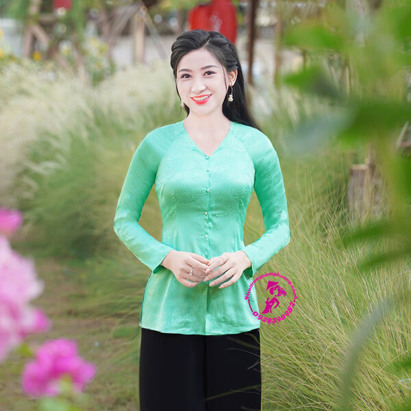 Áo Bà Ba Nữ Xanh Vỏ Đậu Gấm Lụa Hoạ Tiết Hoa Hồng Cổ Tròn