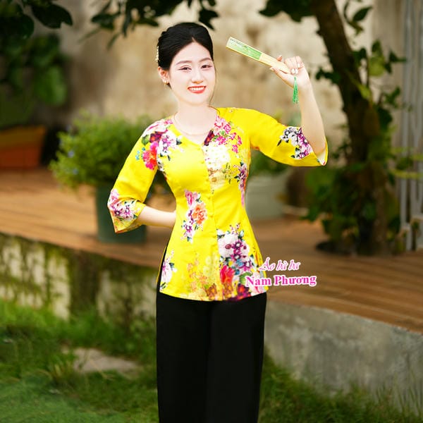 Áo bà ba nữ vàng nghệ gấm lụa hoa tầm xuân cổ tim