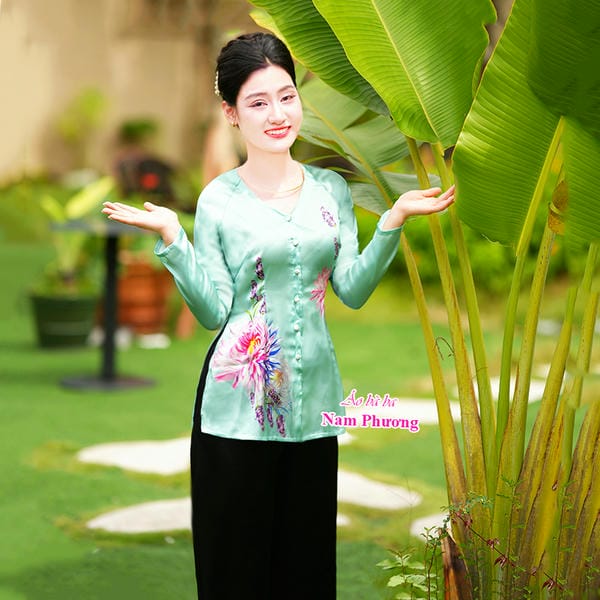 Áo Bà Ba Nữ Xanh Mint Gấm Hoa In Tranh Phong Cảnh